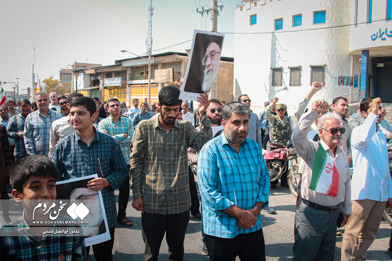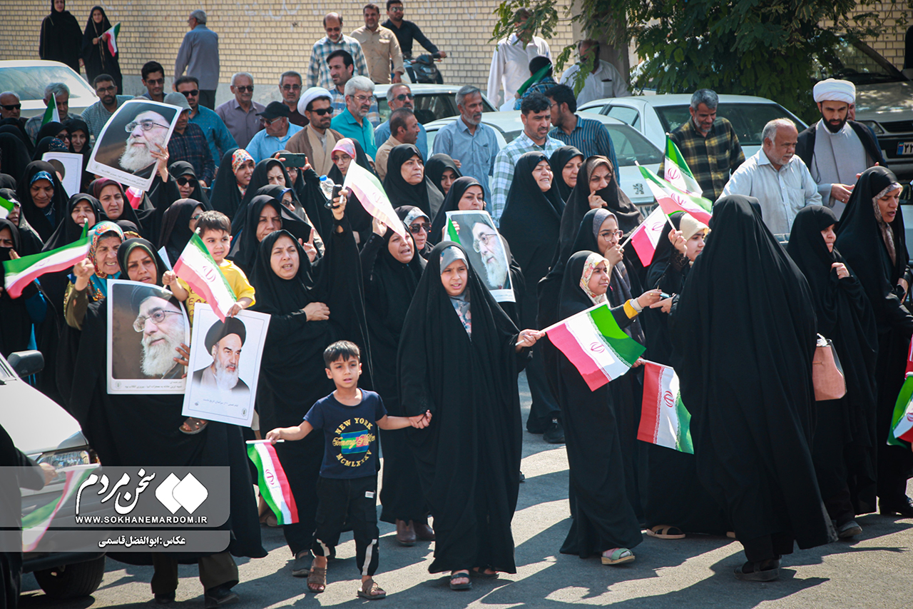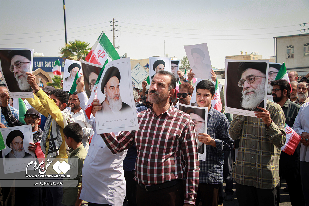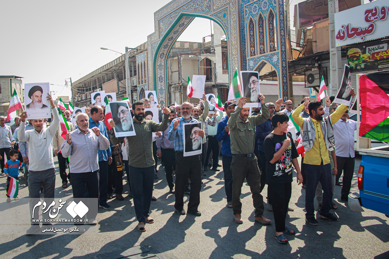 به گزارش سخن مردم: در این مراسم که از مصلای جمعه برازجان آغاز و تا میدان شهید چمران ادامه یافت، اقشار مختلف مردم، خانواده‌های شهدا، روحانیون، بسیجیان و جمعی از مسئولان شهرستان دشتستان حضور داشتند و با سر دادن شعارهایی در حمایت از مقاومت اسلامی فلسطین، جنایات رژیم صهیونیستی را محکوم کردند.