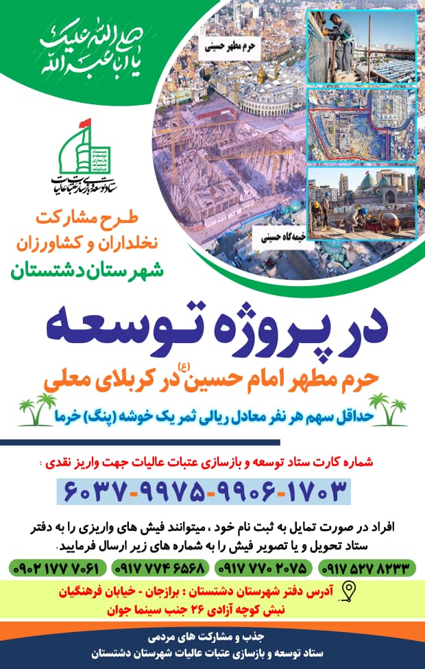 خادم ستاد توسعه و بازسازی عتبات عالیات دشتستان ضمن دعوت از عموم مردم برای مشارکت در این حرکت خداپسندانه تصریح کرد: این طرح فرصتی است تا کشاورزان و نخل‌داران شهرستان سهمی معنوی از برکت نخلستان‌های خود را در توسعه بارگاه امام حسین (ع) تقدیم کنند.
