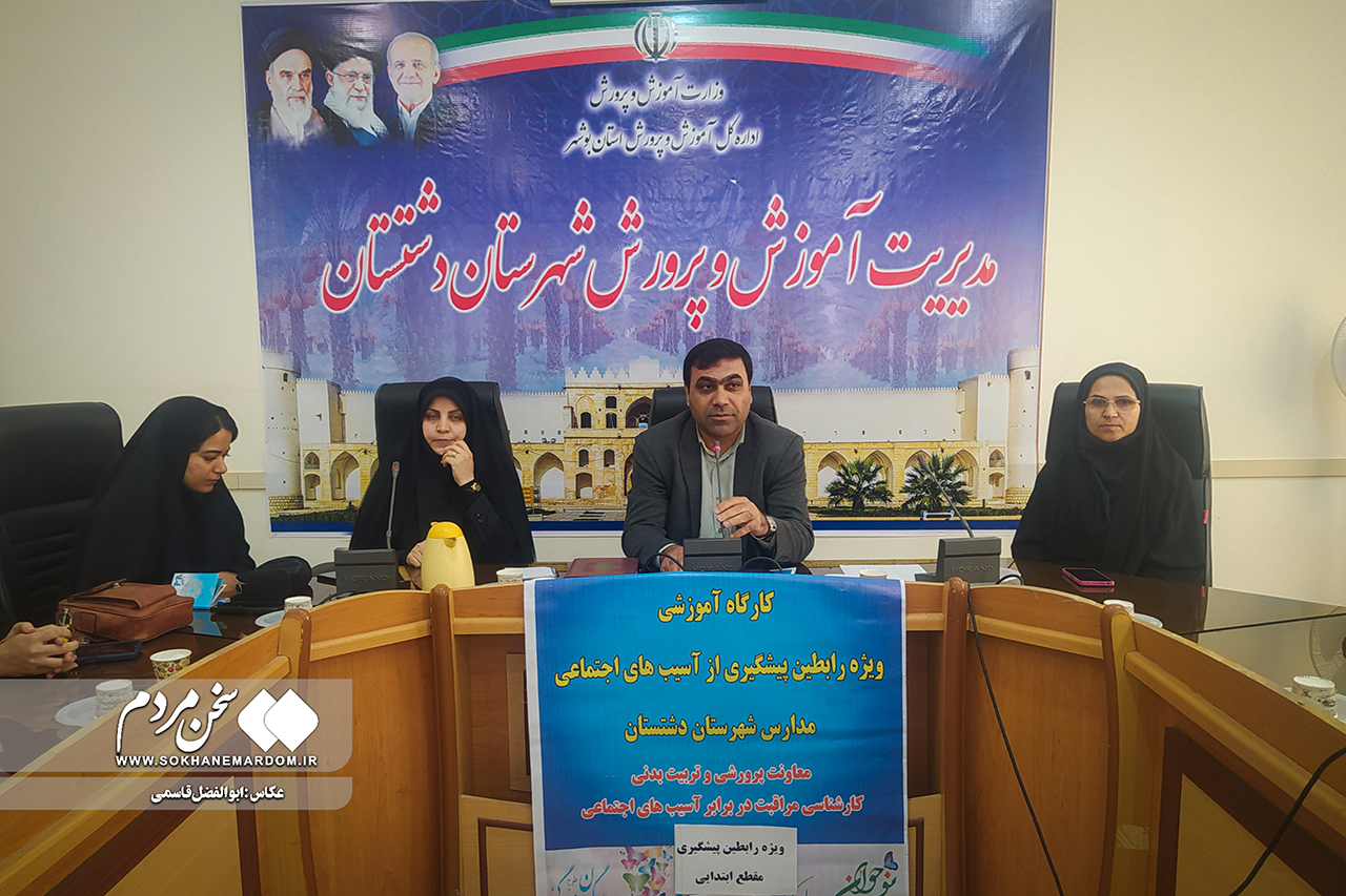 سخن مردم: ابوالفضل قاسمی | کارگاه آموزشی ویژه رابطین پیشگیری از آسیبهای اجتماعی مدارس شهرستان دشتستان با حضور ابوذر خلیفه، معاون پرورشی و تربیتبدنی آموزشوپرورش شهرستان، و سیده فاطمه حسینی بردخونی، کارشناس مراقبت در برابر آسیبهای اجتماعی برگزار شد.