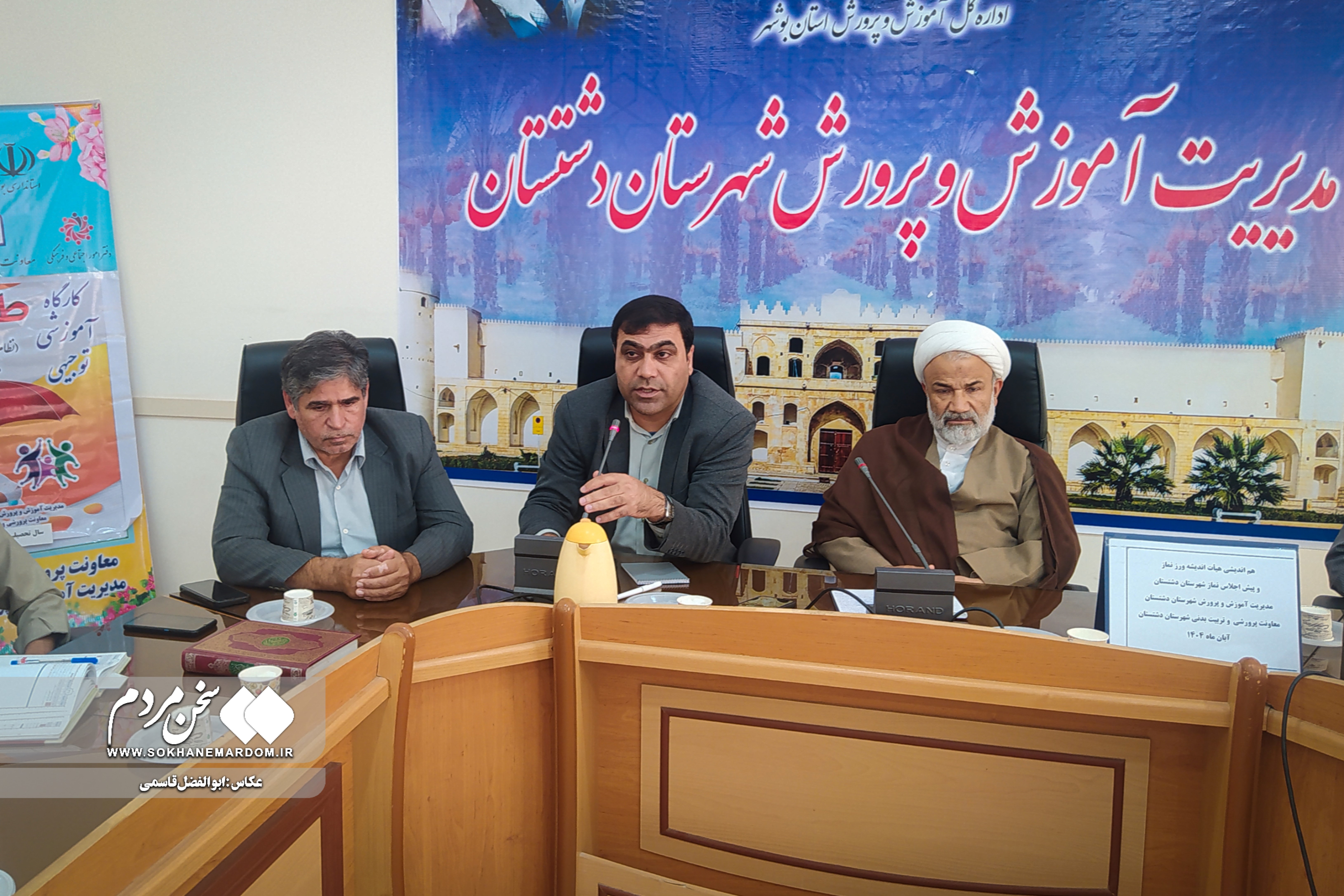 ابوذر خلیفه، معاونت پرورشی و تربیتبدنی آموزشوپرورش شهرستان دشتستان در این نشست اظهار داشت: نماز باید در اولویت برنامههای پرورشی مدارس قرار گیرد. هر اندازه از فرصتهای تربیتی در مدارس برای نهادینهسازی فرهنگ نماز استفاده شود، در تربیت نسلی مؤمن و مسئولیتپذیر موفقتر خواهیم بود.